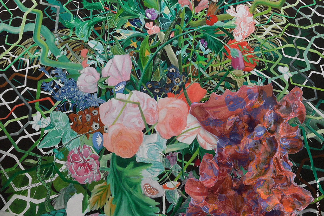 In der Malerei und im Scherenschnitt von Ergül Cengiz entfalten sich komplexe Bildsysteme, inspiriert von islamischer Ornamentik und westlichen Genres wie Landschaftsmalerei und Stillleben.